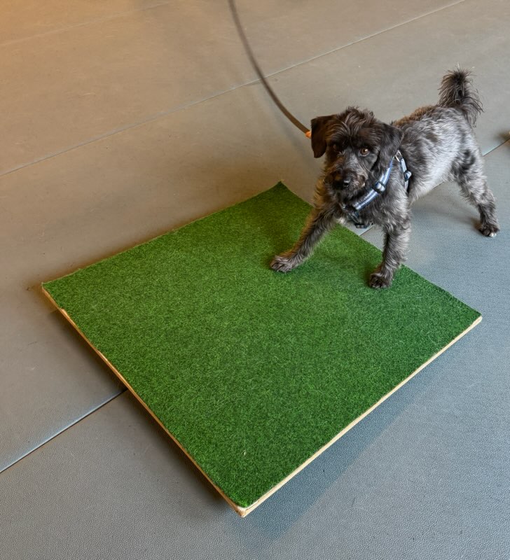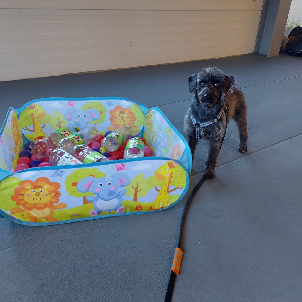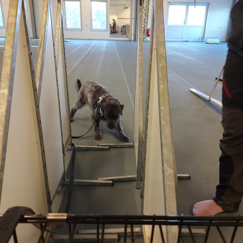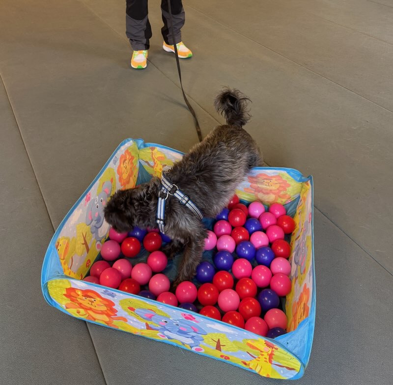Jag fick träna på att leta efter godis i ett bollhav (det var egentligen ganska litet, mer som en pöl än ett hav), stå på en vippbräda, gå in bland petflaskor som välte och att gå in i ett trångt utrymme. Med lite godis och med ett steg i taget kändes det allt bättre. Till slut behövde jag inte sträcka ut mig i hela min längd för att nå godiset utan kunde gå ända fram och hämta det utan att lämna kvar baktassarna.